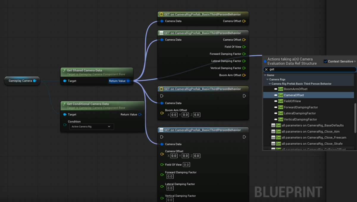 そして、GameplayCameraComponentから取得したCamera Data とCameraVariableCollectionから指定パラメータのGet・Set処理を呼び出すことができます。